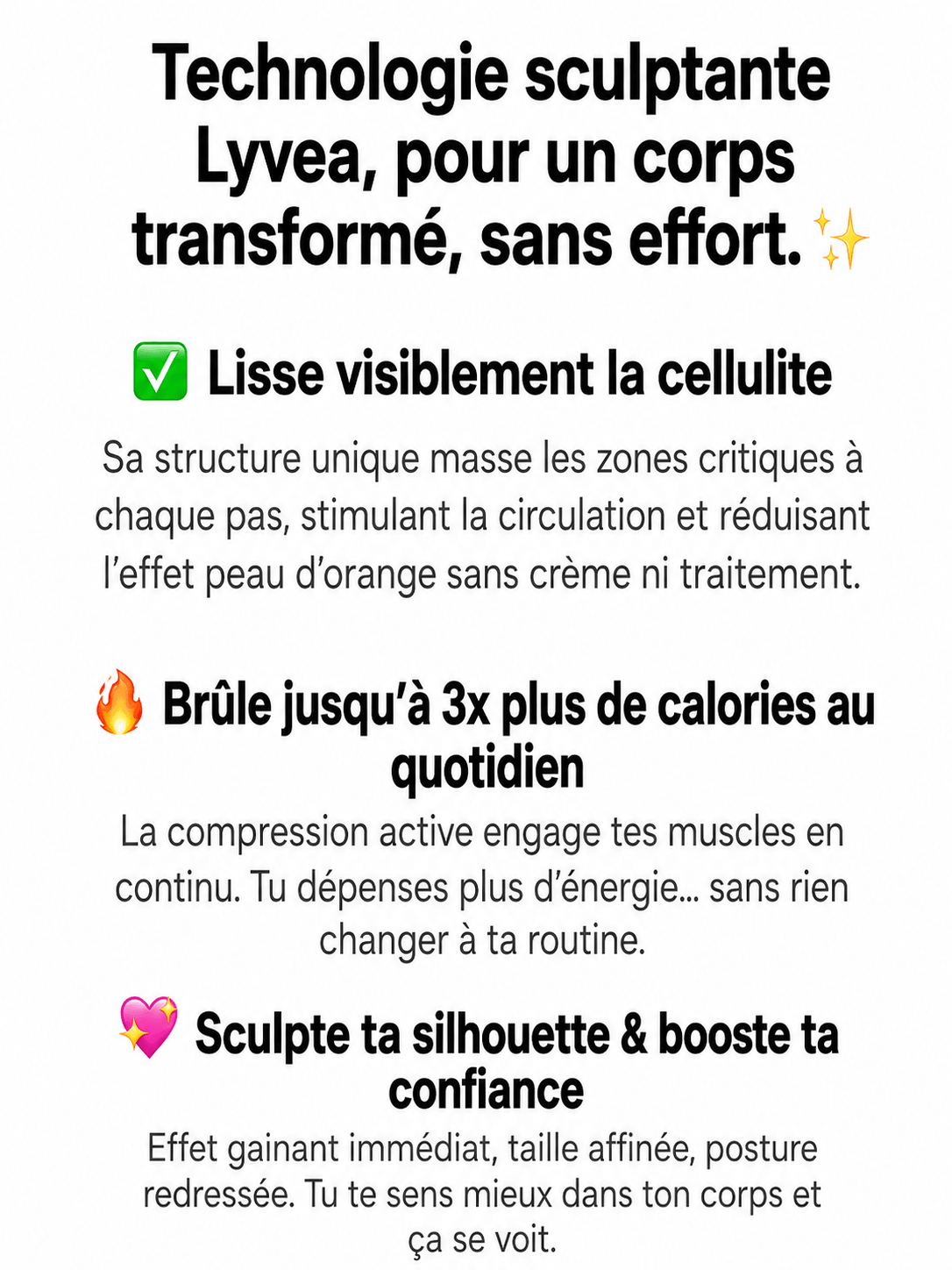 Combinée à une compression douce et ciblée, cette action régulière contribue progressivement à raffermir les jambes, affiner la silhouette et rendre la peau visiblement plus lisse au fil des jours.